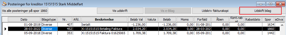 Vedhæftet bilag på købsfaktura kan udskiftes på posteringen på Kreditor eller Finans -> Kontoplan. Tryk på Udskift bilag.