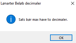 Lønarter med 3 decimaler i beløb bliver ikke vist i feltet. Der kommer i stedet en besked. Ret om muligt beløbet til 2 decimaler