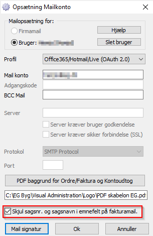 Ønsker du ikke sagsnummer og sagsnavn i emnefeltet på faktura-mail, skal du sætte et flueben i Skjul sagsnr. og sagsnavn i opsætning af din mailprofil.