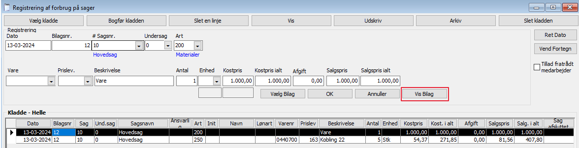 Vedhæftning af bilag på sagslinjen gemmes, når man trykker OK på registreringslinjen og først herefter kan man trykke Vis bilag.