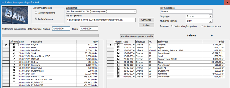 Ved indlæsning af kontoudtog finder programmet automatisk poster på samme beløb og dato dato og sætte flueben på linjen i det indlæste kontoudtog og de bogførte posteringer.
