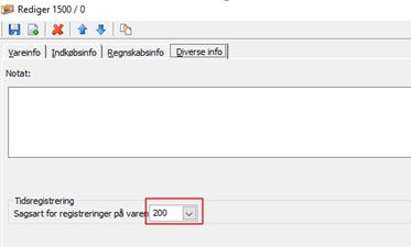 På fanebladet "Diverse info" udfyldes ønsket Sagsart. Det er dette felt der bestemmer, hvordan materialeforbruget fra EG Construction Site indlæses til sagerne.