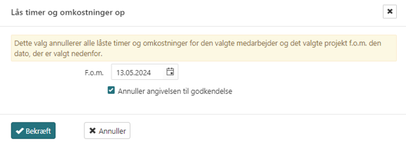 Vælg hvilken dato timerne skal låses op fra. Sæt flueben i Annuller angivelsen til godkendelse og tryk bekræft