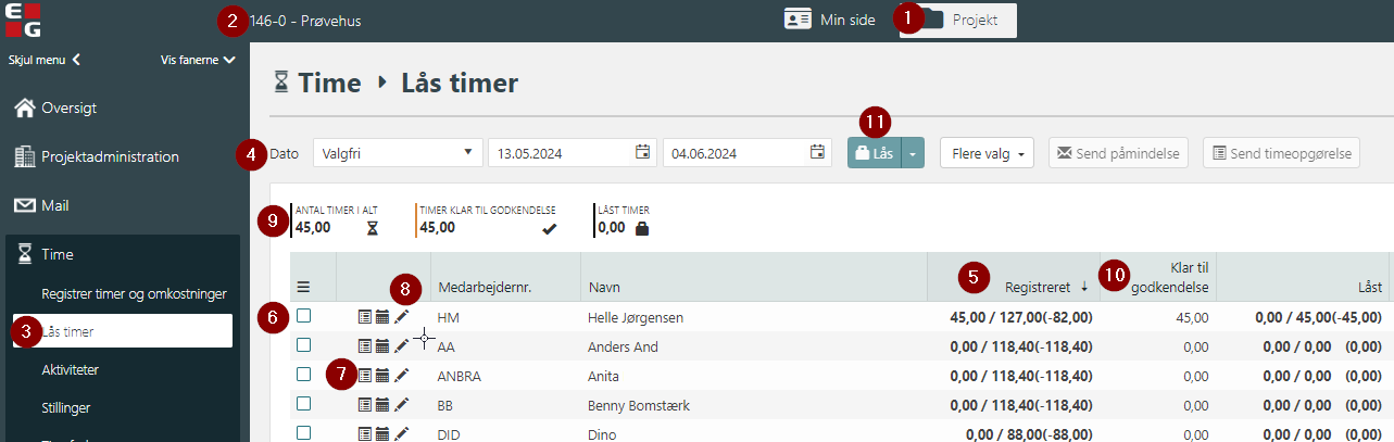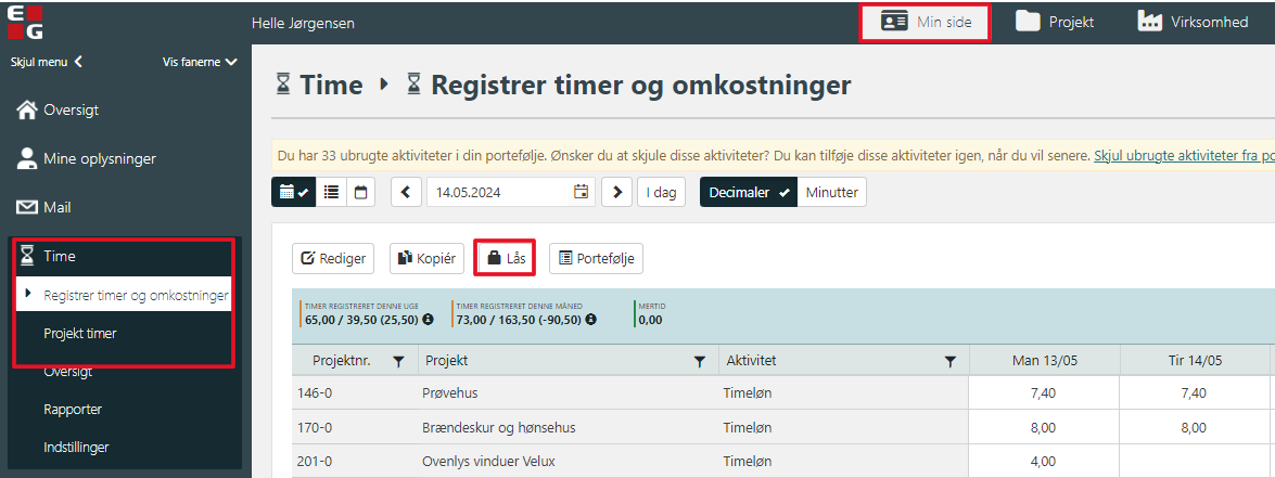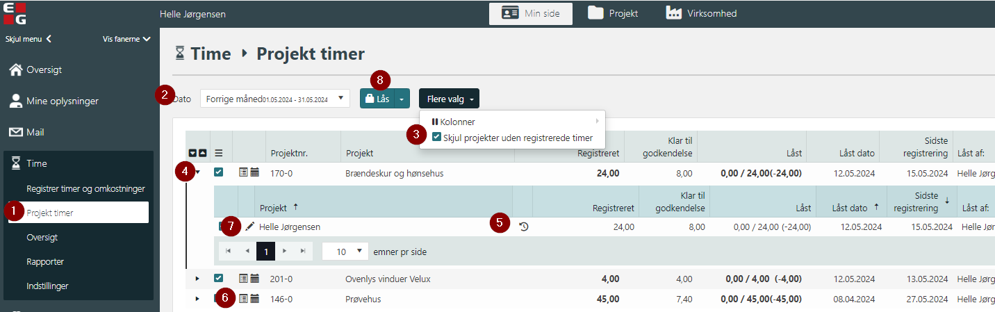 2. Godkender: Projektleder låser timer på Min side > Time > Projekt timer