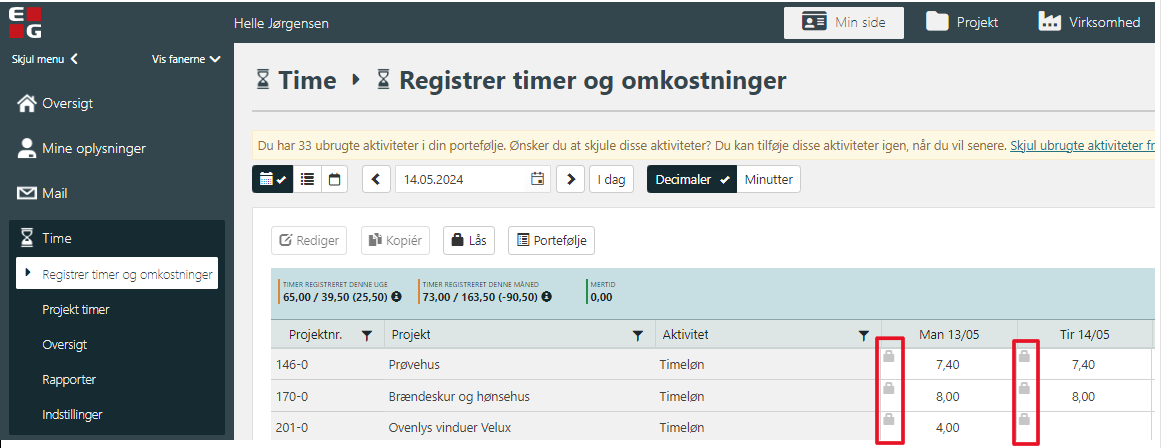 Medarbejder låser timer - viser hængelås ved låsning og kan indlæses i EG Visual