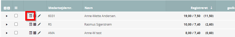 - Klik i feltet Registreret, således at de medarbejdere, der har registreret timer ligger sig øverst i listen