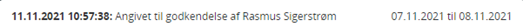 - Indsæt de ønskede datoer – vær opmærksom på til dato, da denne overføres til godkender dato.