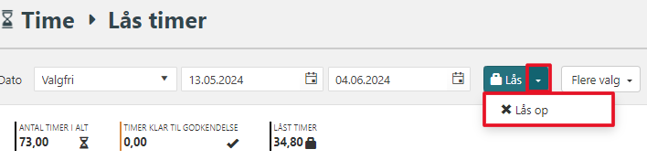 Gå i Virksomhed -> Time -> Lås timer og tryk på pilen ved siden af Lås-knappen