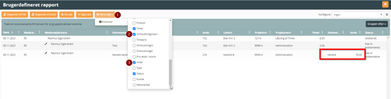 - Tryk evt. på den brugerdefineret rapport, hvor det kan opsættes, at omkostninger og materialer ses.