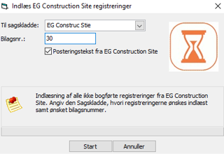Når godkenderne har låst timer og materialer i EG Construction Site, skal disse importeres til sagskladden i EG Visual for endelig godkendelse/bogføring. Importen foretages under Sager -> Import fra EG Site.
