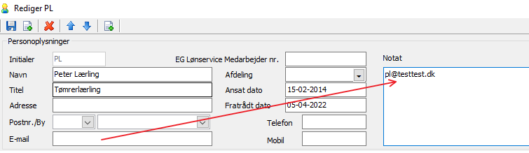 Vælg lærlingen og kopier mailadressen ind i feltet notat og slet den i feltet E-mail.