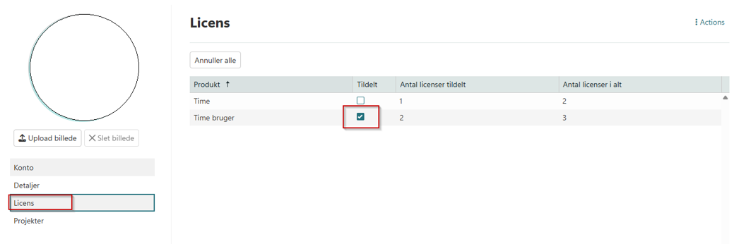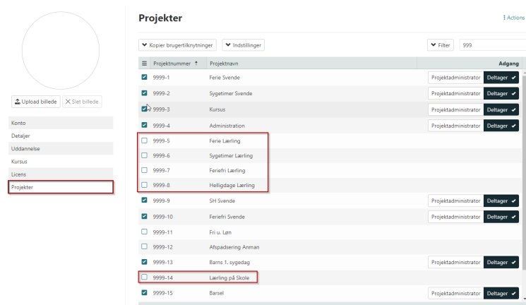 Tjek under de enkelte faner, at medarbejderen er korrekt opsat på projekter, licenser og detaljer.