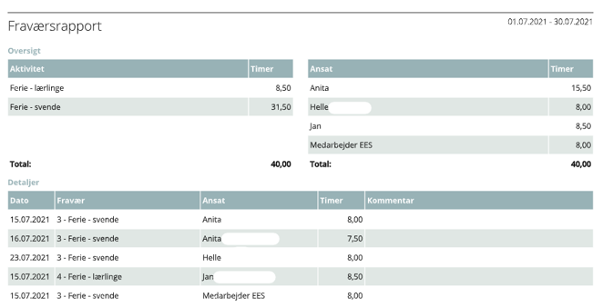 Der vises en total pr. medarbejder for en afgrænset periode. Nederst på siden vises fraværet i detaljer.