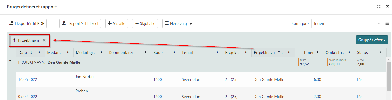 Hvis man trækker projektnavn op i øverste grå felt, bliver registreringerne sorteret pr. projekt.