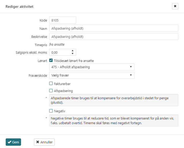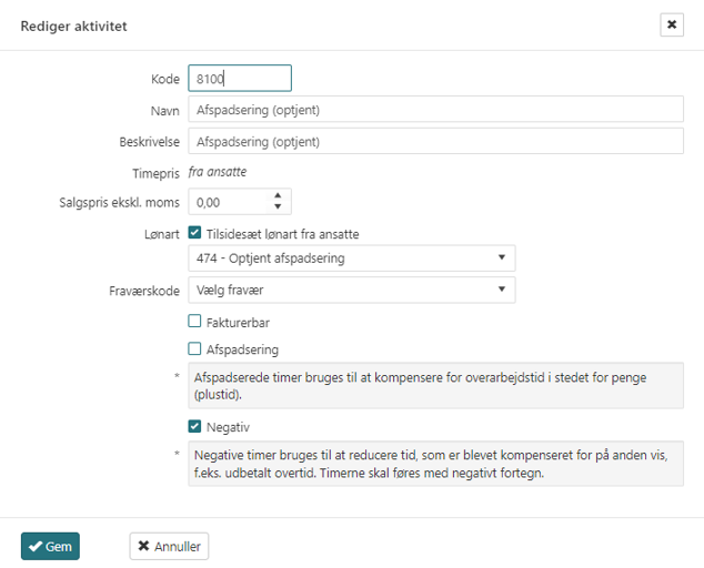 Dernæst åbnes Time -> Aktiviteter. Aktiviteten Timeløn fjernes på projektet og der oprettes to nye aktiviteter Afspadsering optjent og Afspadsering afholdt på projektet.