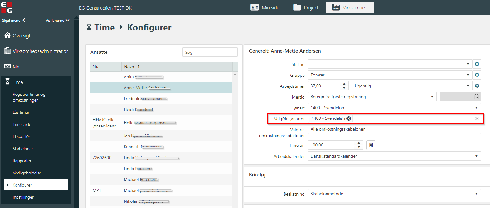 Valgfrie lønarter opsættes under Virksomhed > Time > Konfigurer