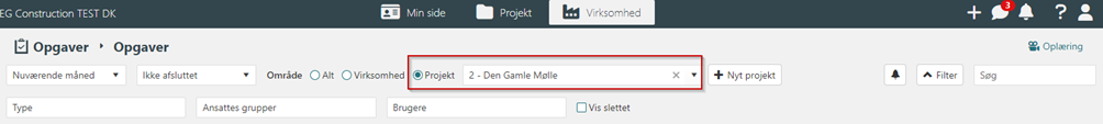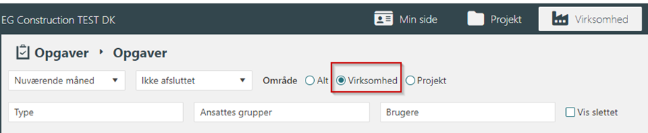 Gruppeopgaver kan kun ses i samme område, enten Virksomhed eller Projekt.