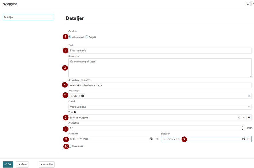 4. Ansvarlig på opgaven – f.eks. bogholder/projektleder m.m. Skal alle eller nogle medarbejdere deltage, skal de også sættes på. Opgaven bliver synlig for alle deltagere i kalender eller på Min side.