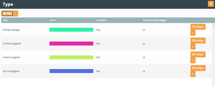 Her opretter man og sætter farve på de forskellige typer af opgaver, som man har i virksomheden.