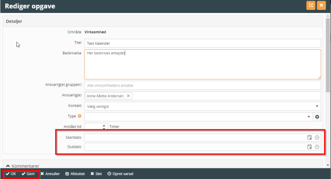 8. Indsæt slutdato og tid. Det er kun opgaver med slutdato, som vises i Ressouceplanlæggeren.