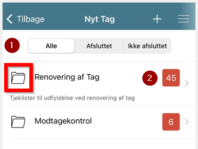 - Det er muligt at sortere på Alle, Afsluttede og Ikke afsluttede tjeklister