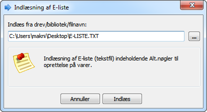 Punktet findes under Varer -> Indlæs E-liste (klassisk menu: Funktioner -> Varer -> Indlæsning E-liste)