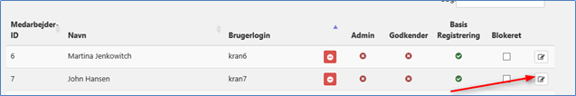 Ud for den aktuelle medarbejder trykker du på Rediger-ikonet yderst til højre: