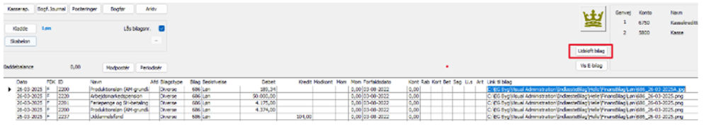 Link til bilag: Der kan kobles en kvittering på en kladdelinien. Tryk pil ned i feltet "Link til bilag". Find kvitteringen i stifinder og dobbeltklik på det. Link til kvitteringen vises.