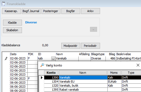 FDK: Her vælges hvilken kontotype posteringen skal bogføres på: