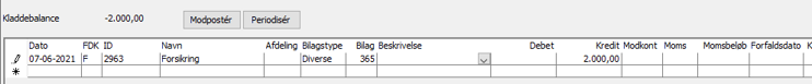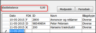 Kladdebalance: Når du er færdig med at indtaste kladdelinjer, skal du sikre dig at kladdebalancen går i nul. Hvis ikke dette er tilfældet, kan du prøve at lukke kladden og åbne den igen, derved genberegnes kladdebalancen: