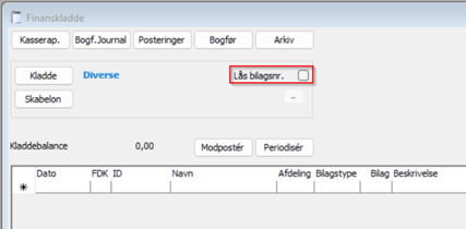 Hvis man ønsker samme bilagsnr. på alle posteringer i den kladde man står i, kan nummeret låses ved at sætte flueben i feltet