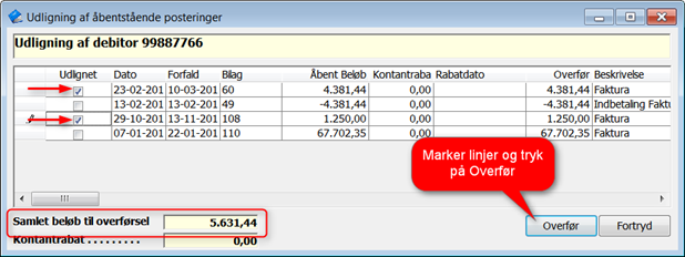 Saldoen på udlignede poster ses i feltet "Samlet beløb til overførsel". Når du har færdigudlignet, trykkes på knappen i bunden "Overfør", eller ved tryk på <Enter>.