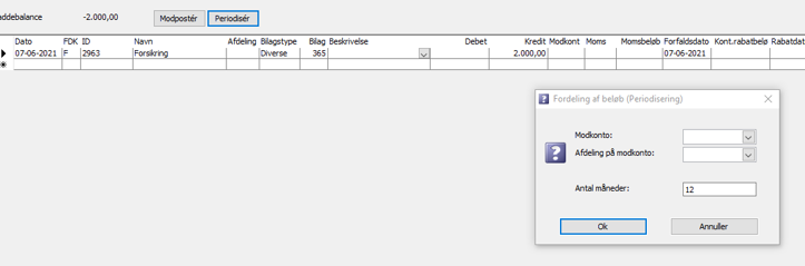 Modkonto, er den periodiseringskonto (aktiver eller passiver) hvor du vil have dine omkostning/indtægt parkeret indtil de aktiveres. Antal måneder – her vælger, du hvordan du ønsker periodisering.