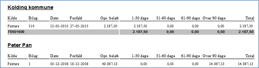 Specificeret aldersfordelt saldooversigt viser alle åbne poster, samt en visning af hvornår fakturaerne er udstedt. Denne kan benyttes som opgørelse til revisoren men skal trækkes på dato den skal bruges for at være retvisende da den korrigere for posteringer der er udlignet efterfølgende