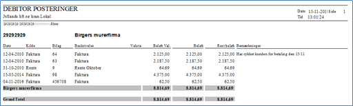 Posteringsliste kan f.eks. udskrives på kun åbne poster. Udskriften indeholder desuden evt. bemærkninger fra posteringerne (findes under Debitor -> Debitor udskrifter-> Posteringslister)