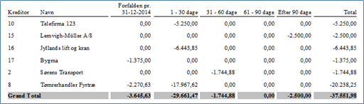 Likviditetsliste viser i totaler, hvor meget der forfalder i de enkelte perioder (findes under Kreditor -> Kreditor udskrifter -> Saldolister)