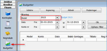 - Model/konto: Indtast/vælg budgetmodel samt finanskonto.