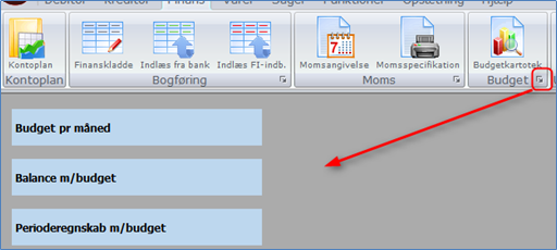 Alle budget udskrifterne findes ved at klikke på den lille firkant i gruppen Budget: