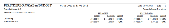 - Perioderegnskab m. budget: Denne udskrift kan kun anvendes hvis man har tillægsmodulet "Regnskabsopstillinger. Udskriften viser realiseret/budget/afvigelse både for perioden samt for år-til-dato.