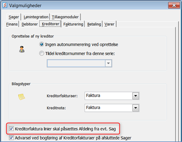 Derudover skal du tage stilling til, om dine kreditorfakturaer skal arve afdeling fra evt. sag der påføres kreditorfakturaerne. Dette vælges under Opsætninger -> Valgmuligheder (klassisk menu: Opsætning -> Valgmuligheder) under fanen "Kreditor":