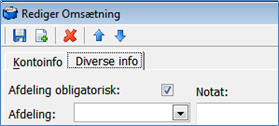 På hver finanskonto – under fanen "Diverse info" kan du vælge af Afdeling er obligatorisk for at få lov til at bogføre på kontoen. Du kan derudover vælge forslag til afdeling: