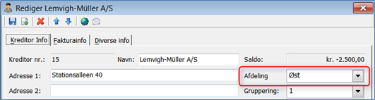 Du kan på dine kreditorer vælge forslag til afdeling, som vil blive ført med over på fakturaer fra den aktuelle leverandør. Har du valgt at afdeling skal følge sagen, overstyres kreditorens afdeling med afdeling fra sagen: