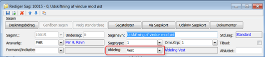 Tip: Ved fakturering på en sag hentes afdeling fra varenr. Er der ikke valgt afdeling på varenr., eller faktureres linjer uden varenr, arves afdeling automatisk fra sagen.