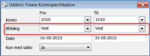 Du har mulighed for på diverse finansudskrifter at afgrænse på afdeling. F.eks. ved udskrivning af en kontospecifikation kan du vælge kun at udskrive posteringer vedr. en bestemt afdeling: