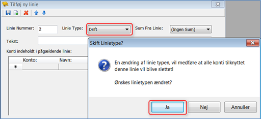 Typen skal ændres til "Drift", da omsætningen jo ligger oppe under resultatopgørelsen. Når typen ændres vises en advarsel. Svar "Ja" til denne eller tryk <Enter>