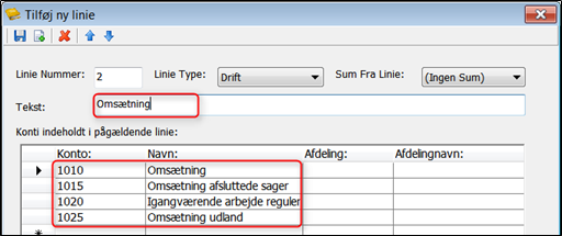Nu indtastes/vælges de konti fra kontoplanen der skal indgå i min sum af omsætningen: