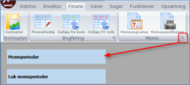 Hvis du vil ændre dine momsperioder, klikkes på den lille firkant i gruppen Moms (klassisk menu: Opsætning -> Moms -> Momsperioder).