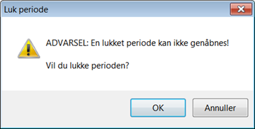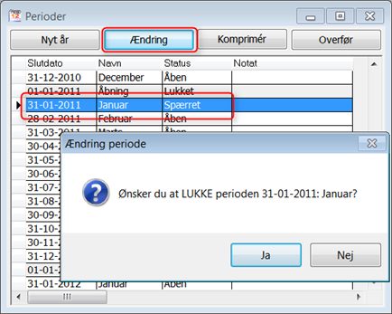 Når perioderne er spærret skal de lukkes. Vend tilbage til den 1. periode der skal komprimeres, klik på knappen "Ændring". Svar nu "Ja" til at LUKKE perioden: