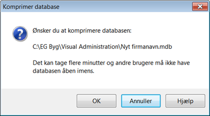 Når alle ønskede regnskabsår er komprimeret, skal hele databasen komprimeres. Dette gøres under Funktioner -> Generelle funktioner -> Databasefunktioner -> Komprimér database.