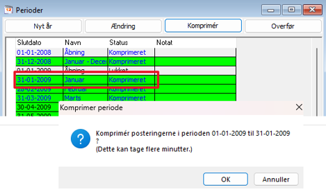 Marker første periode for regnskabsåret - f.eks. 31-01-2009, klik på knappen "Komprimér", og svar JA for at komprimere finansposterne i det valgt regnskabsår.